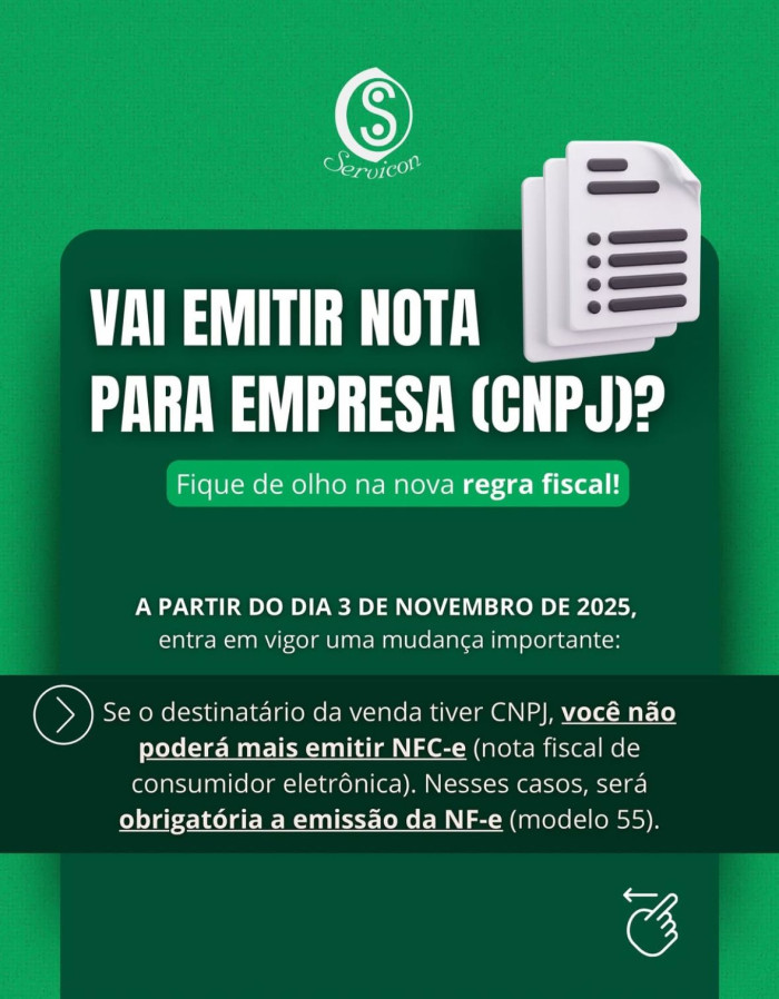 A partir de 3 de novembro de 2025, não será mais permitido emitir NFC-e para destinatários com CNPJ.